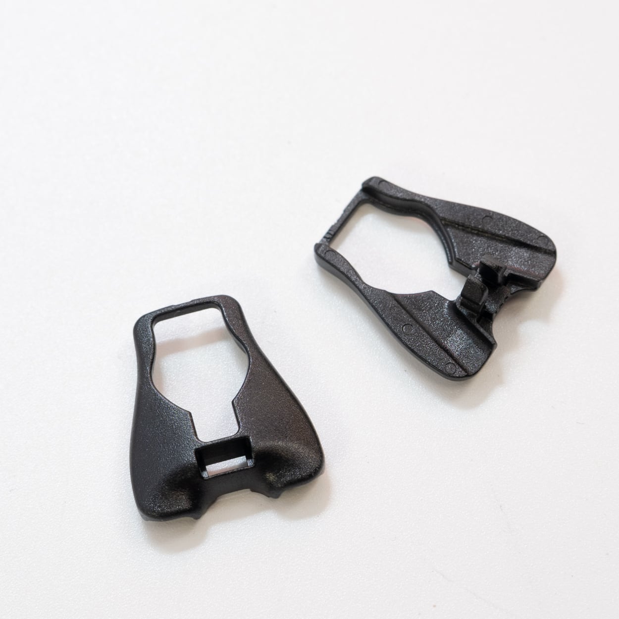 寝袋や防寒ウェアで使われるYKK #5ファスナーにつけることで、生地噛みを防止するパーツ。